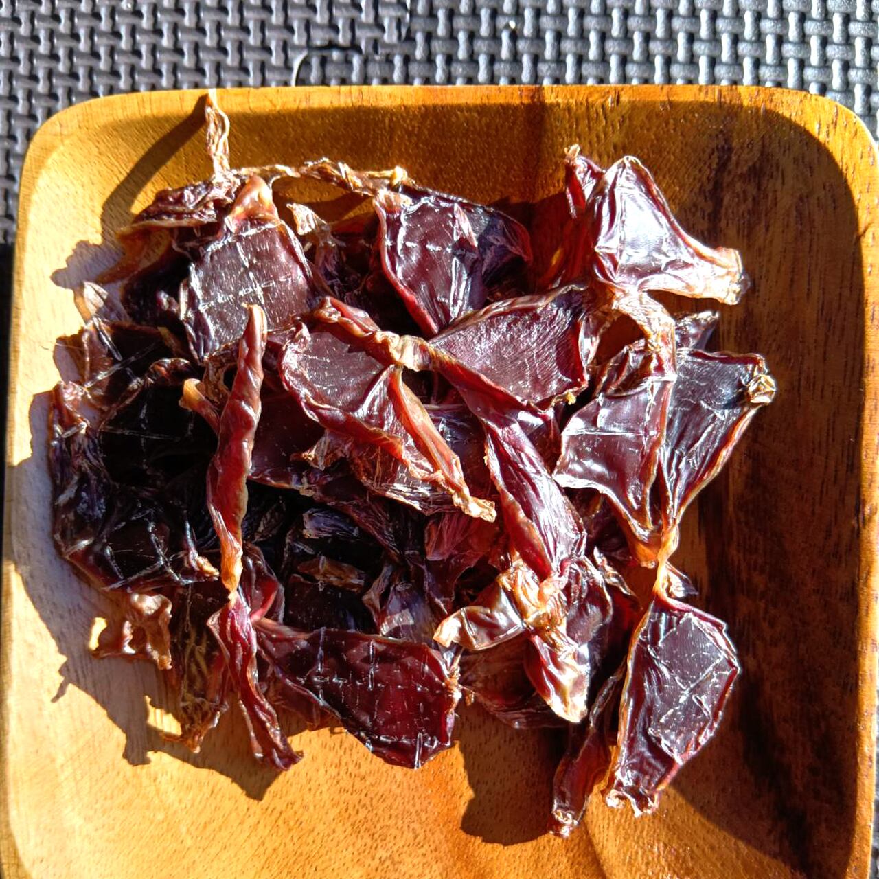 飼料にハーブを添加、植物性原料の多い飼料で飼育された国産の鶏を使用した鶏砂肝のジャーキーです。